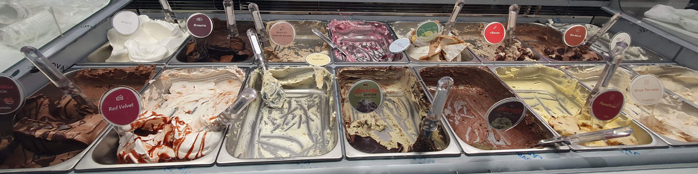 Besondere Eissorten gibt es auch hier. Es überrascht Lavendel mit sehr reichem Aroma, Salbei - Lorbeereis auch intensiv aber gewöhnungsbedürftig. Rübenspitzeneis, Radiccioeis, Birneneis, Granatapfeleis - alles in Bio.