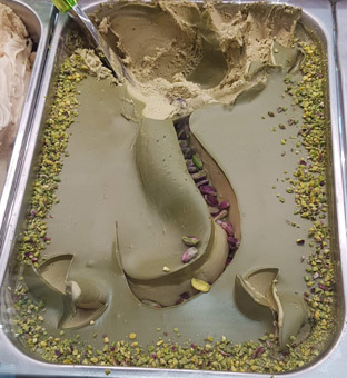 100 % gehackte Pistazien in extra Qualität. Die Pistazien werden grün geerntet, von der Schale befreit, geschält, geröstet und gehackt. Die Pistazien werden in Italien verarbeitet, verpackt und in die ganze Welt verkauft. Da die Pistazien grün geerntet werden, ist der Pistaziengeschmack noch nicht so stark ausgeprägt. Pistazien werden für die Eisdekoration, Konditoreiprodukte und für andere Dekorationen verwendet.