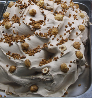 | Helles Schokoladeeis mit ganzen Haselnüssen, dunkles Schokoladeeis mit Baiser Stückchen, Mandeleis mit ganzen Pistazien |